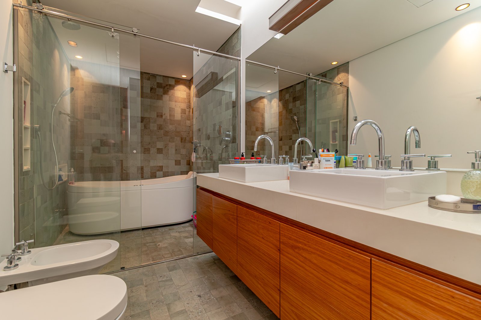 São 6 suítes espaçosas, todas com janelas do piso ao teto, oferecendo muita luz natural e vistas encantadoras. Os banheiros são um show à parte, com acabamentos em pedra natural e atenção minuciosa aos detalhes.