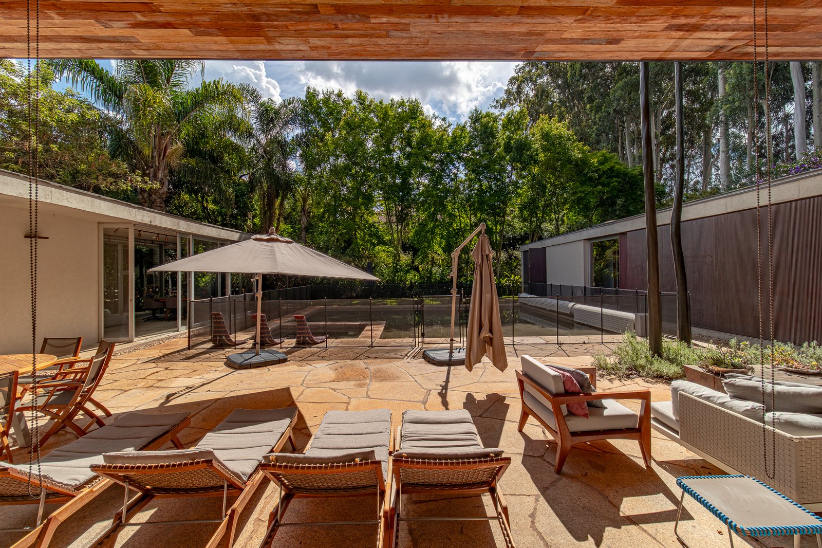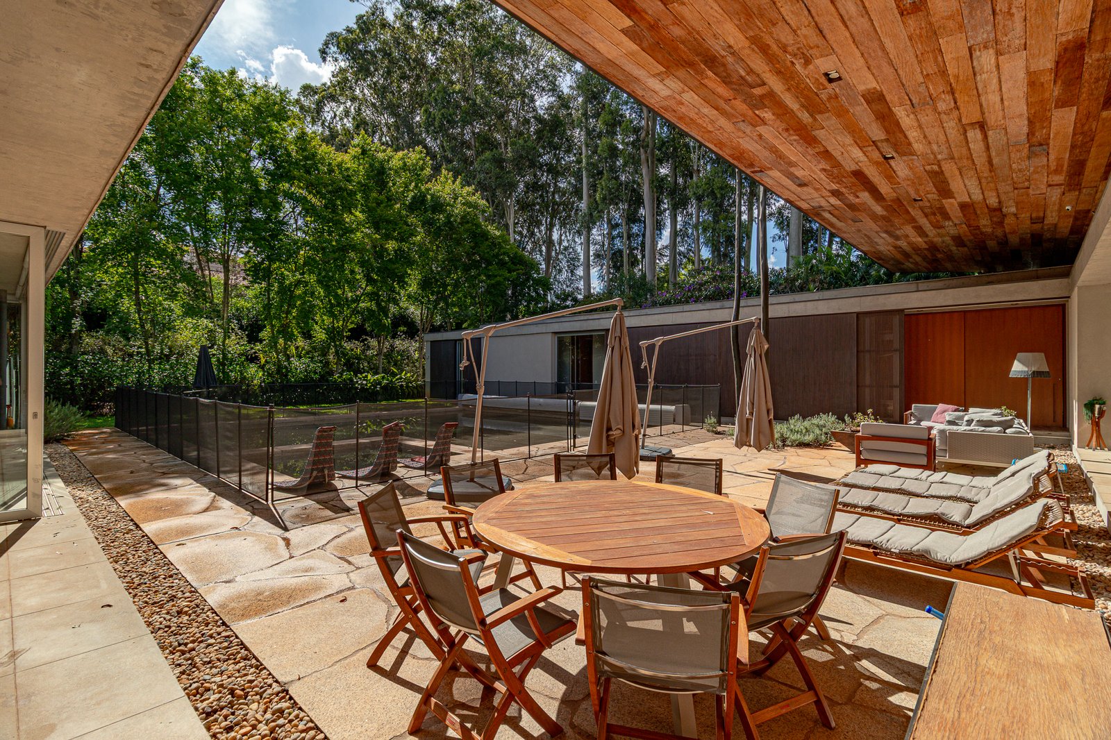 No exterior, o paisagismo impecável valoriza cada ângulo da propriedade. Espreguiçadeiras e redes para descanso criam ambientes perfeitos para contemplar o entorno. O espaço gourmet, completo com churrasqueira, convida a momentos memoráveis com família e amigos.