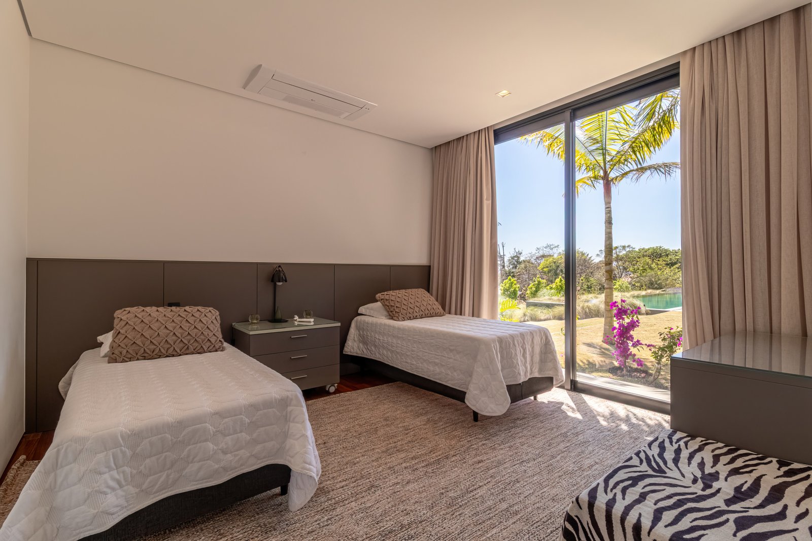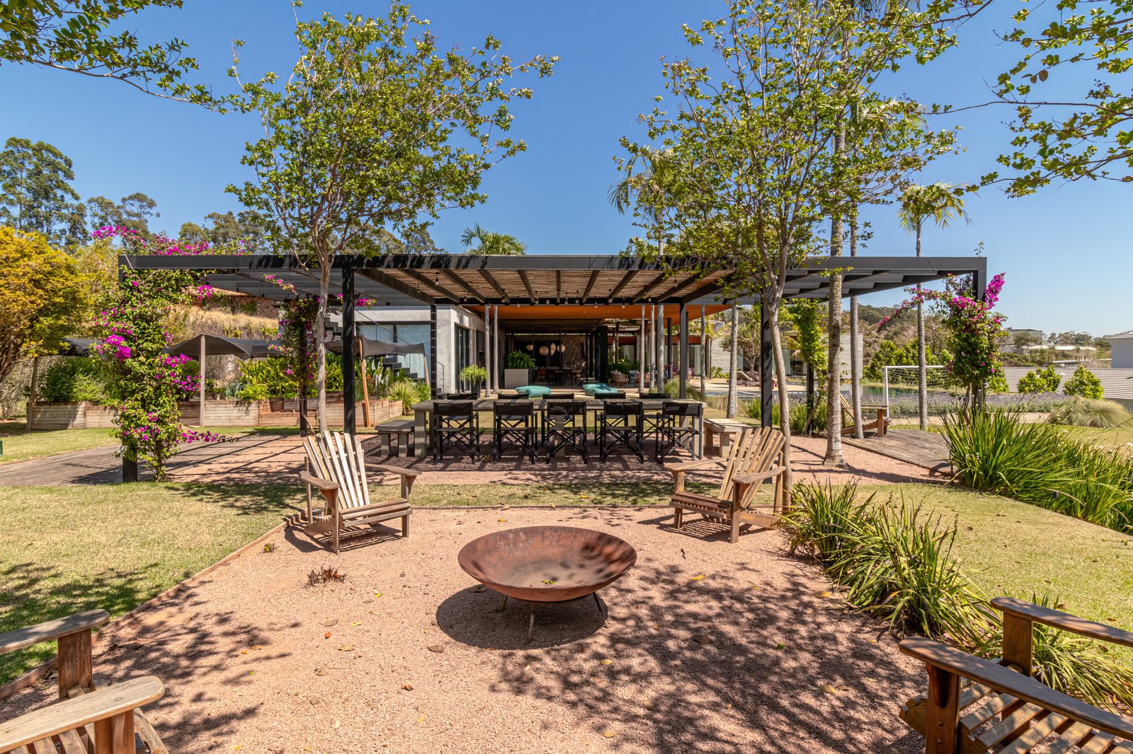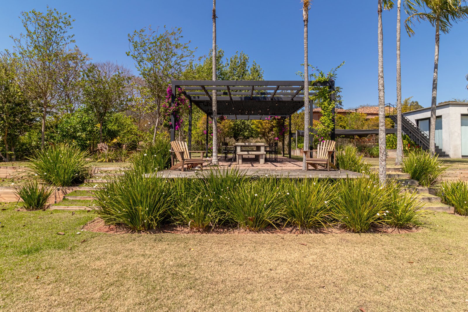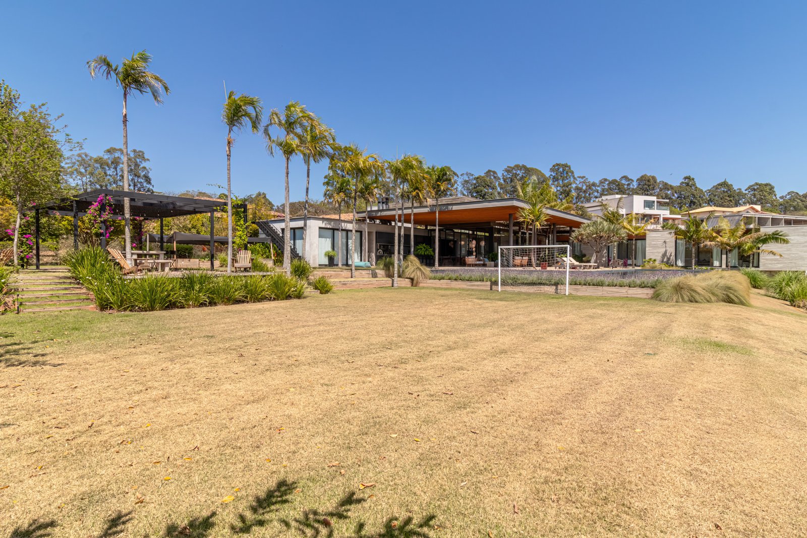 Casa à venda no Condomínio Fazenda da Grama - Itupeva/SP. Residência térrea localizada na parte alta da Fazenda da Grama, em área nobre e silenciosa, fora da rota de aviões e distante dos ruídos do autódromo e de eventos festivos. Com orientação solar norte, o imóvel oferece excelente iluminação natural e conforto térmico ao longo do dia. O projeto arquitetônico é assinado por Lucas Padovani, com interiores desenvolvidos por Paulo Azevedo e paisagismo elaborado por Alexandre Furcolin. A casa conta com cinco suítes, brinquedoteca, quarto de serviço e cozinha equipada com móveis Ornare. Todos os ambientes sociais e o jardim possuem sistema de automação, e a climatização é completa em toda a residência, incluindo uma grelha integrada à sala. A área externa é ampla e contempla um jardim exuberante com pergolado, lareira externa, pomar, horta, campo de futebol e redário. O espaço gourmet é integrado à área social, ideal para receber com conforto e sofisticação. A piscina possui raia, prainha e spa, com aquecimento solar. No rooftop, um generoso deck de madeira oferece vista panorâmica privilegiada. A infraestrutura do imóvel inclui poço artesiano, placas fotovoltaicas, esperas para gerador, tomada para carro elétrico e adega embutida com capacidade para 500 garrafas.