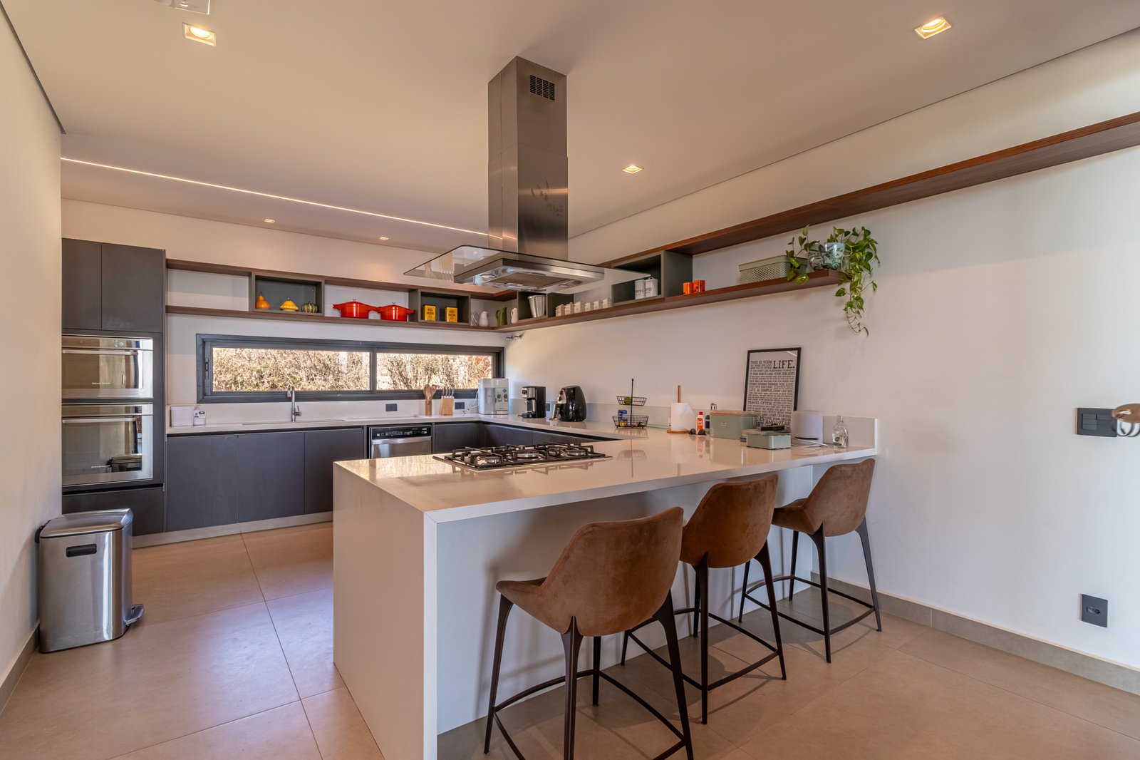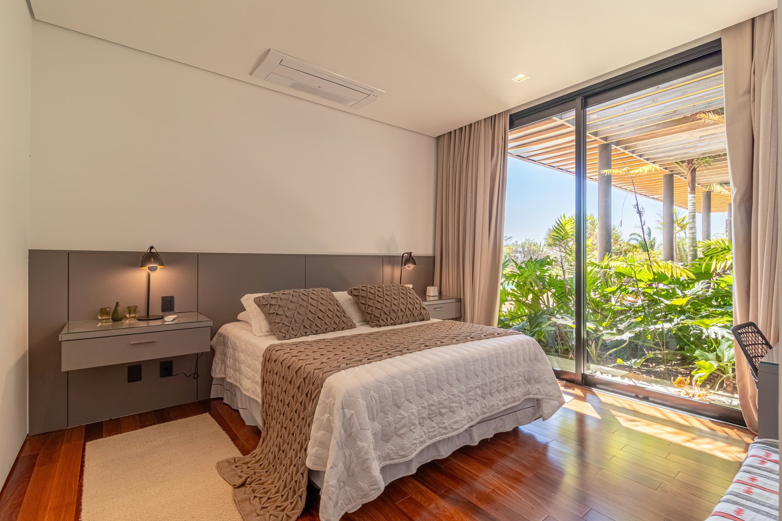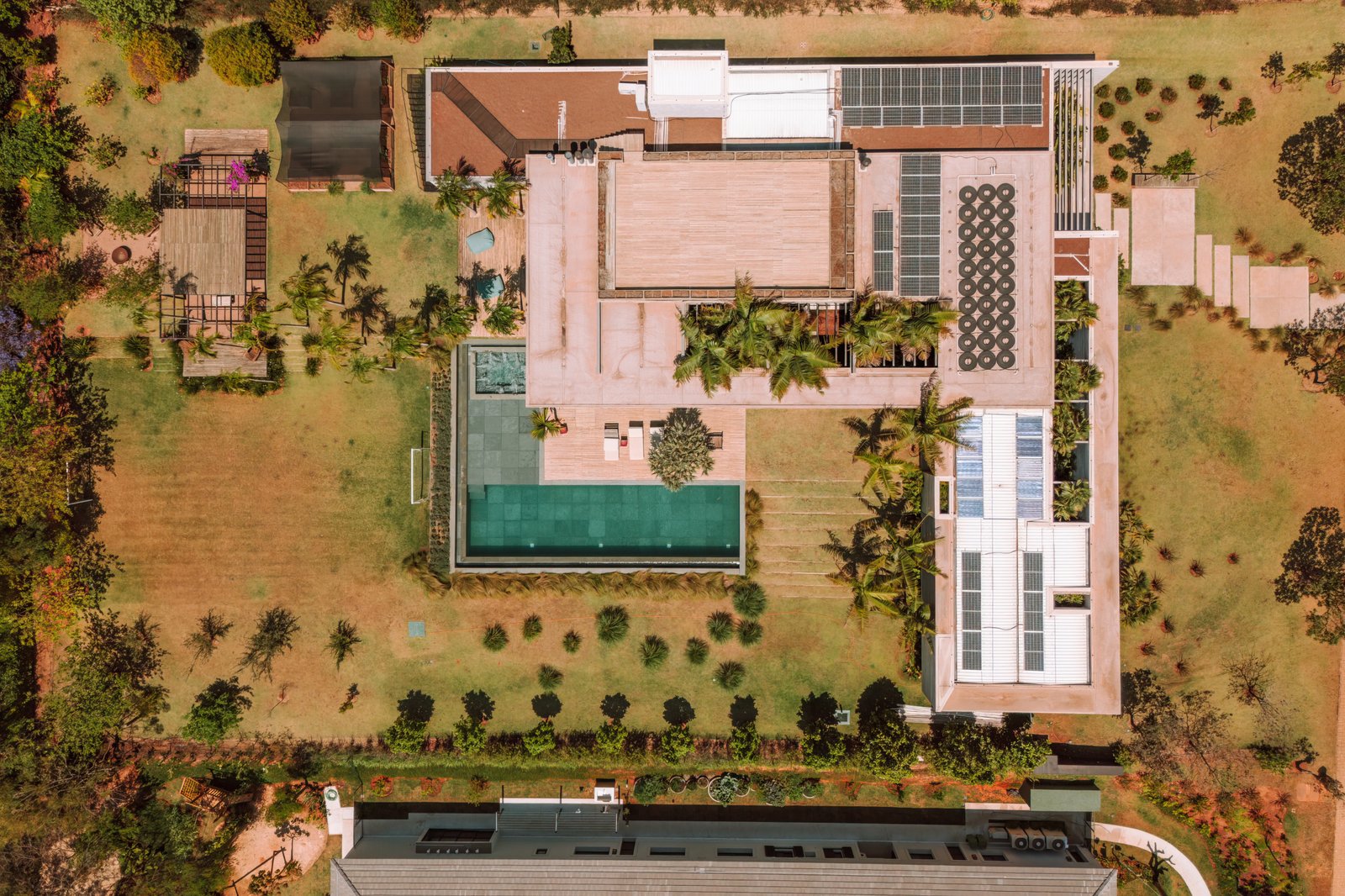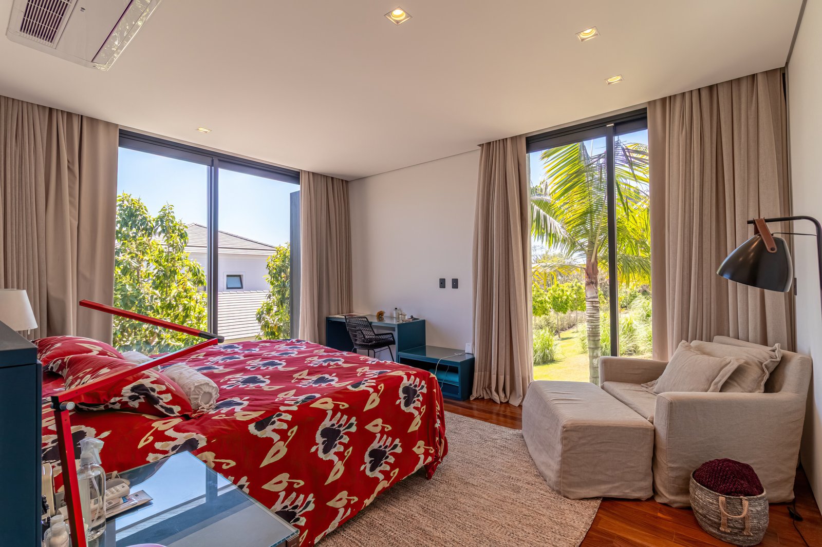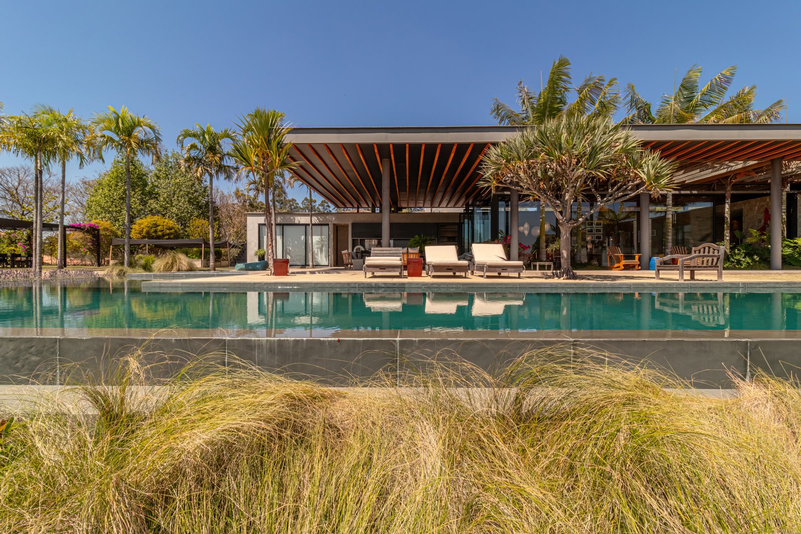 Casa à venda no Condomínio Fazenda da Grama - Itupeva/SP. Residência térrea localizada na parte alta da Fazenda da Grama, em área nobre e silenciosa, fora da rota de aviões e distante dos ruídos do autódromo e de eventos festivos. Com orientação solar norte, o imóvel oferece excelente iluminação natural e conforto térmico ao longo do dia. O projeto arquitetônico é assinado por Lucas Padovani, com interiores desenvolvidos por Paulo Azevedo e paisagismo elaborado por Alexandre Furcolin. A casa conta com cinco suítes, brinquedoteca, quarto de serviço e cozinha equipada com móveis Ornare. Todos os ambientes sociais e o jardim possuem sistema de automação, e a climatização é completa em toda a residência, incluindo uma grelha integrada à sala. A área externa é ampla e contempla um jardim exuberante com pergolado, lareira externa, pomar, horta, campo de futebol e redário. O espaço gourmet é integrado à área social, ideal para receber com conforto e sofisticação. A piscina possui raia, prainha e spa, com aquecimento solar. No rooftop, um generoso deck de madeira oferece vista panorâmica privilegiada. A infraestrutura do imóvel inclui poço artesiano, placas fotovoltaicas, esperas para gerador, tomada para carro elétrico e adega embutida com capacidade para 500 garrafas.