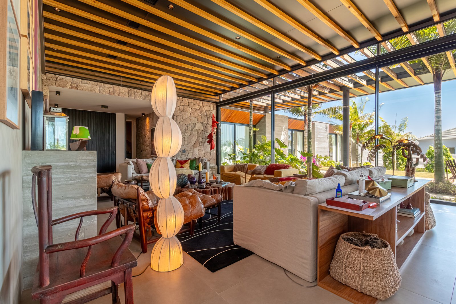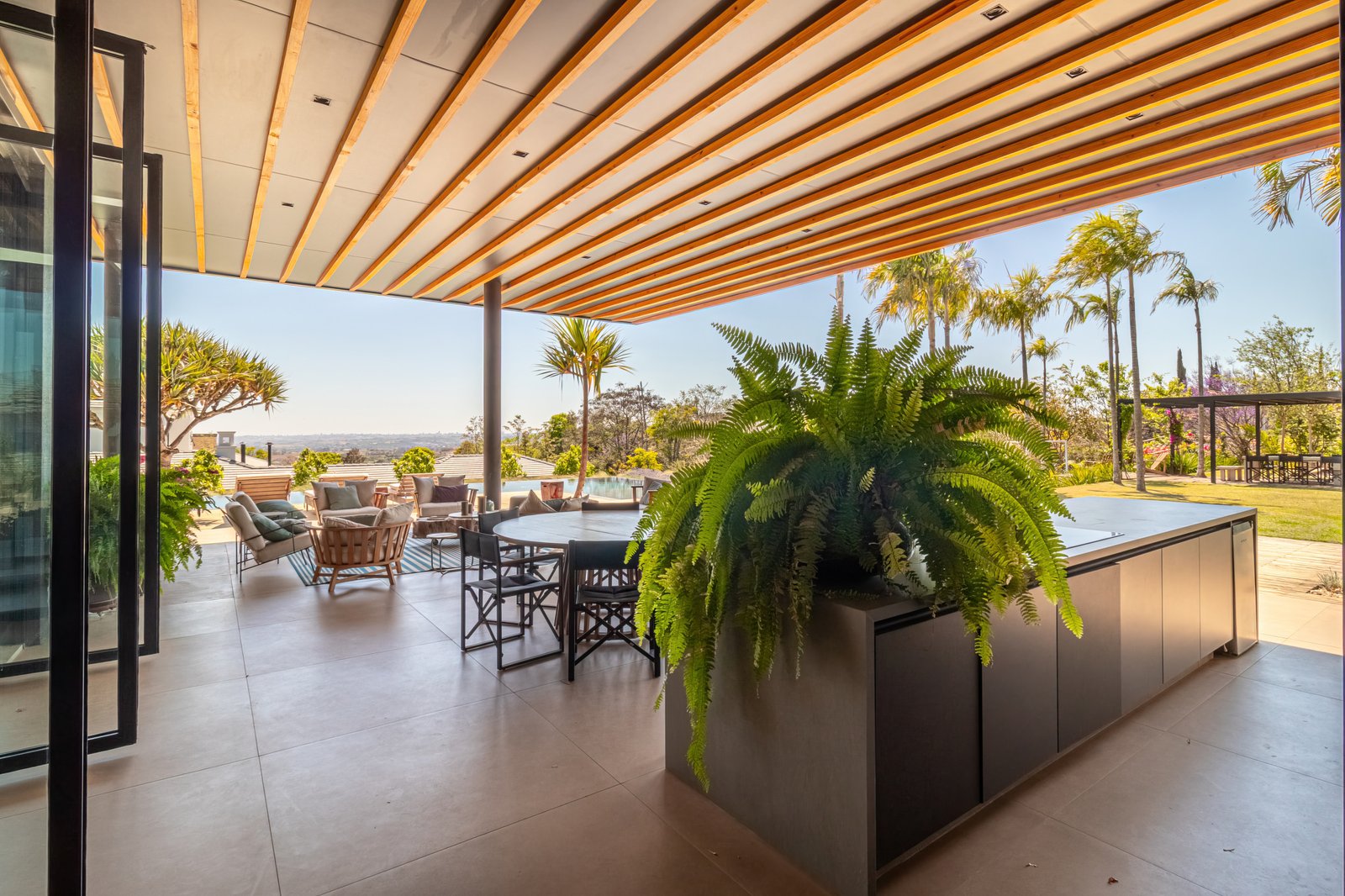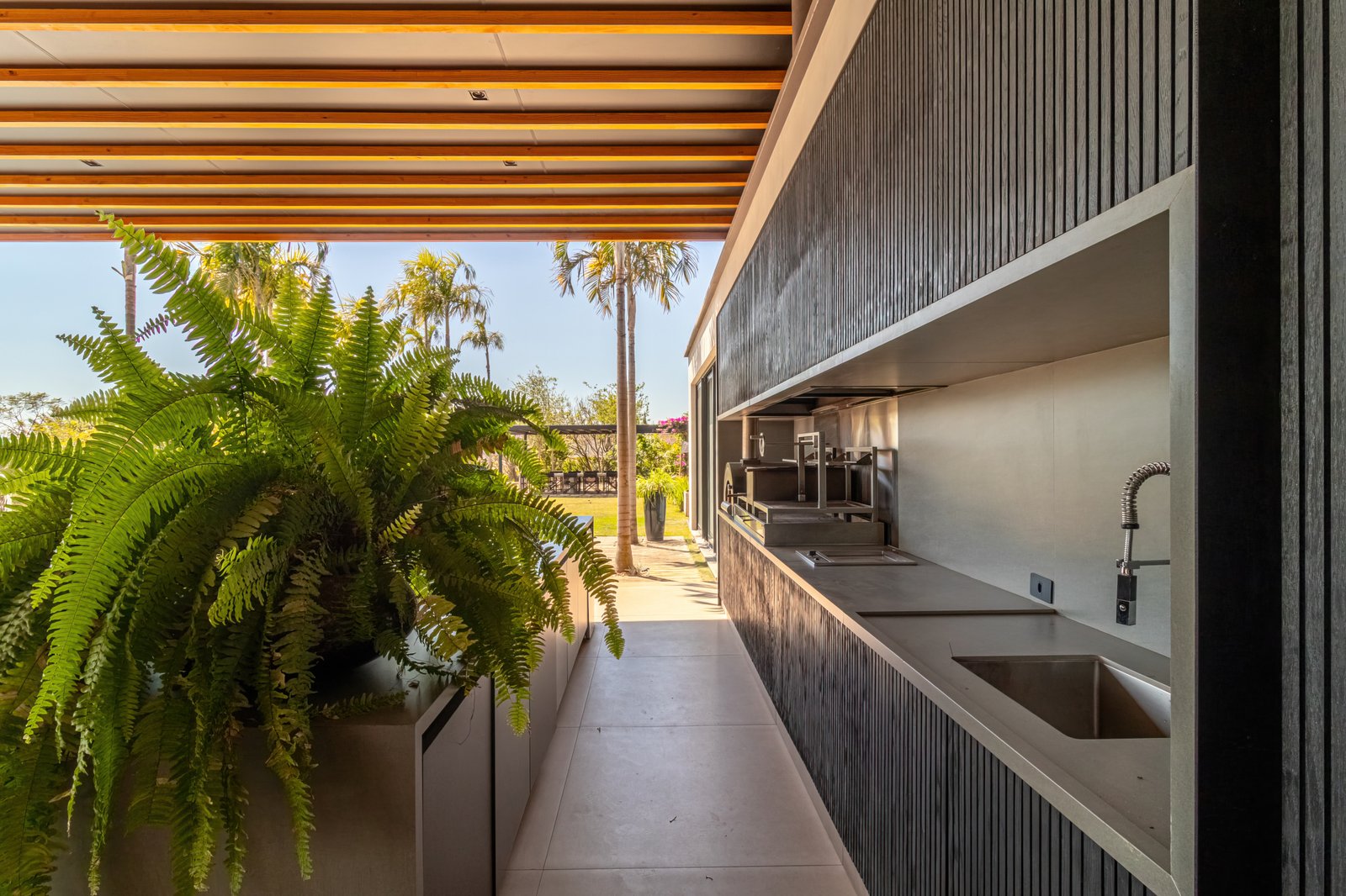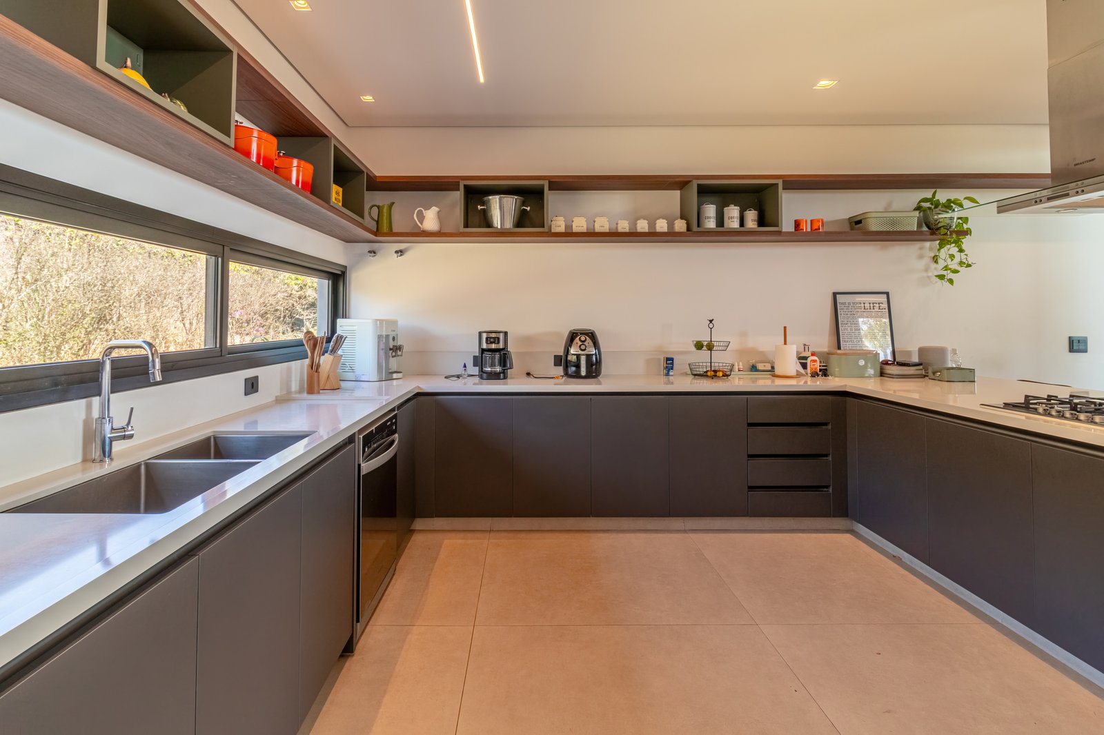 Casa à venda no Condomínio Fazenda da Grama - Itupeva/SP. Residência térrea localizada na parte alta da Fazenda da Grama, em área nobre e silenciosa, fora da rota de aviões e distante dos ruídos do autódromo e de eventos festivos. Com orientação solar norte, o imóvel oferece excelente iluminação natural e conforto térmico ao longo do dia. O projeto arquitetônico é assinado por Lucas Padovani, com interiores desenvolvidos por Paulo Azevedo e paisagismo elaborado por Alexandre Furcolin. A casa conta com cinco suítes, brinquedoteca, quarto de serviço e cozinha equipada com móveis Ornare. Todos os ambientes sociais e o jardim possuem sistema de automação, e a climatização é completa em toda a residência, incluindo uma grelha integrada à sala. A área externa é ampla e contempla um jardim exuberante com pergolado, lareira externa, pomar, horta, campo de futebol e redário. O espaço gourmet é integrado à área social, ideal para receber com conforto e sofisticação. A piscina possui raia, prainha e spa, com aquecimento solar. No rooftop, um generoso deck de madeira oferece vista panorâmica privilegiada. A infraestrutura do imóvel inclui poço artesiano, placas fotovoltaicas, esperas para gerador, tomada para carro elétrico e adega embutida com capacidade para 500 garrafas.
