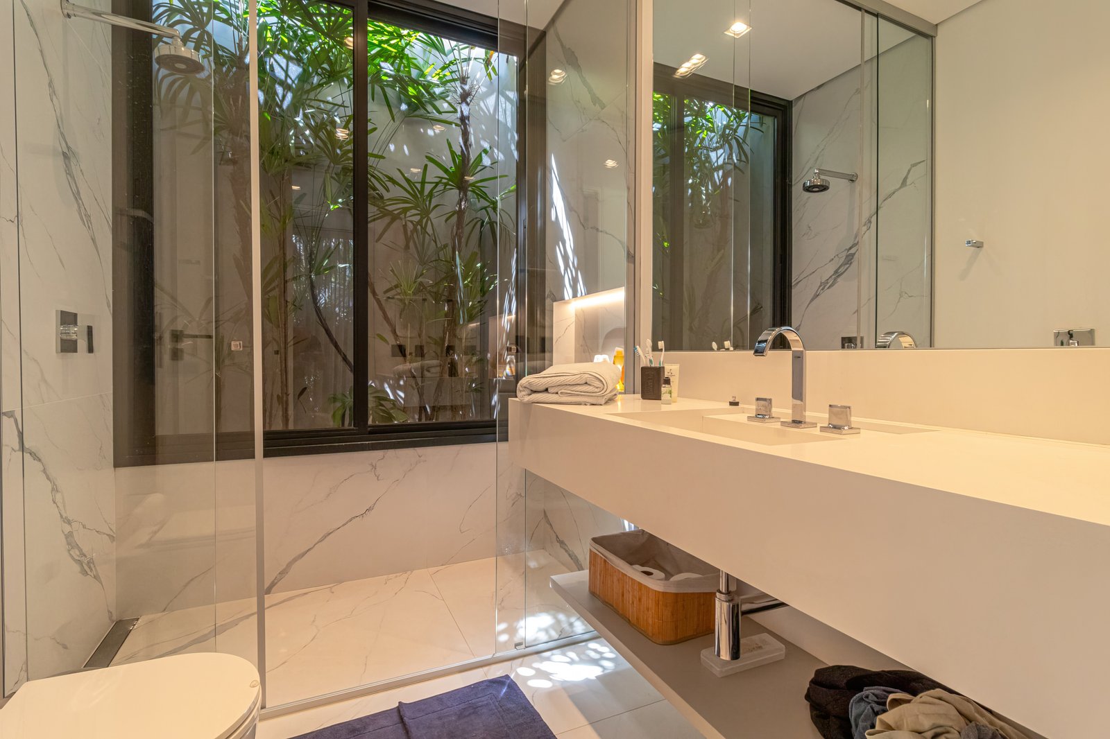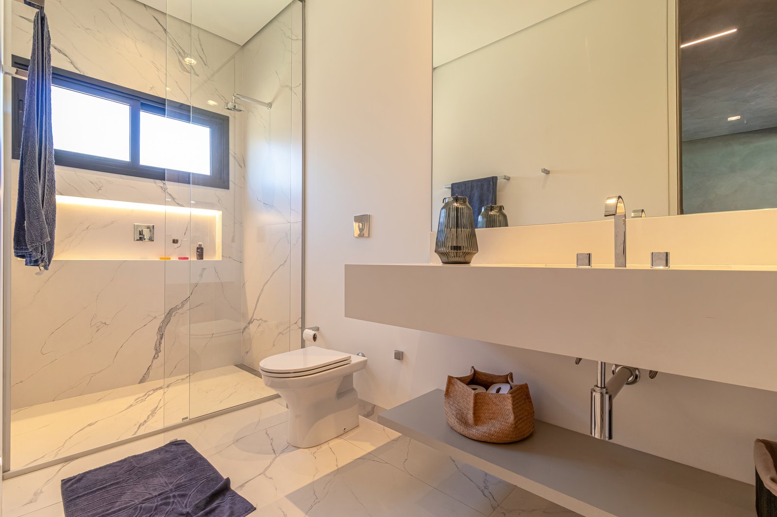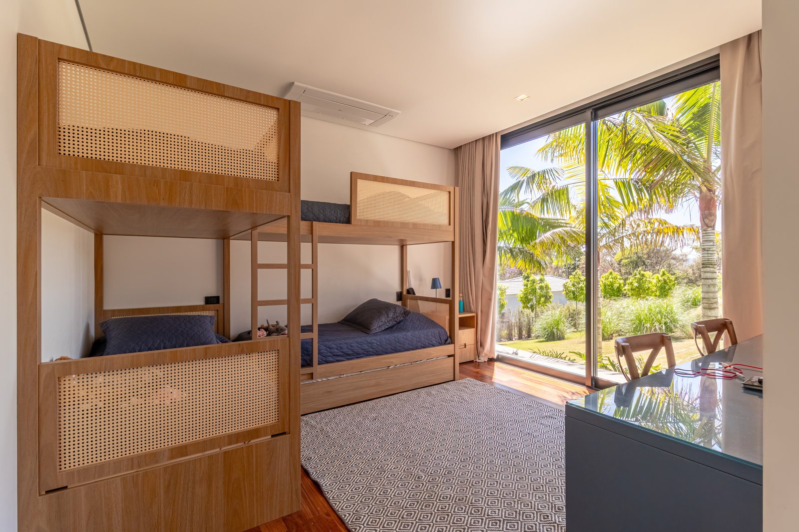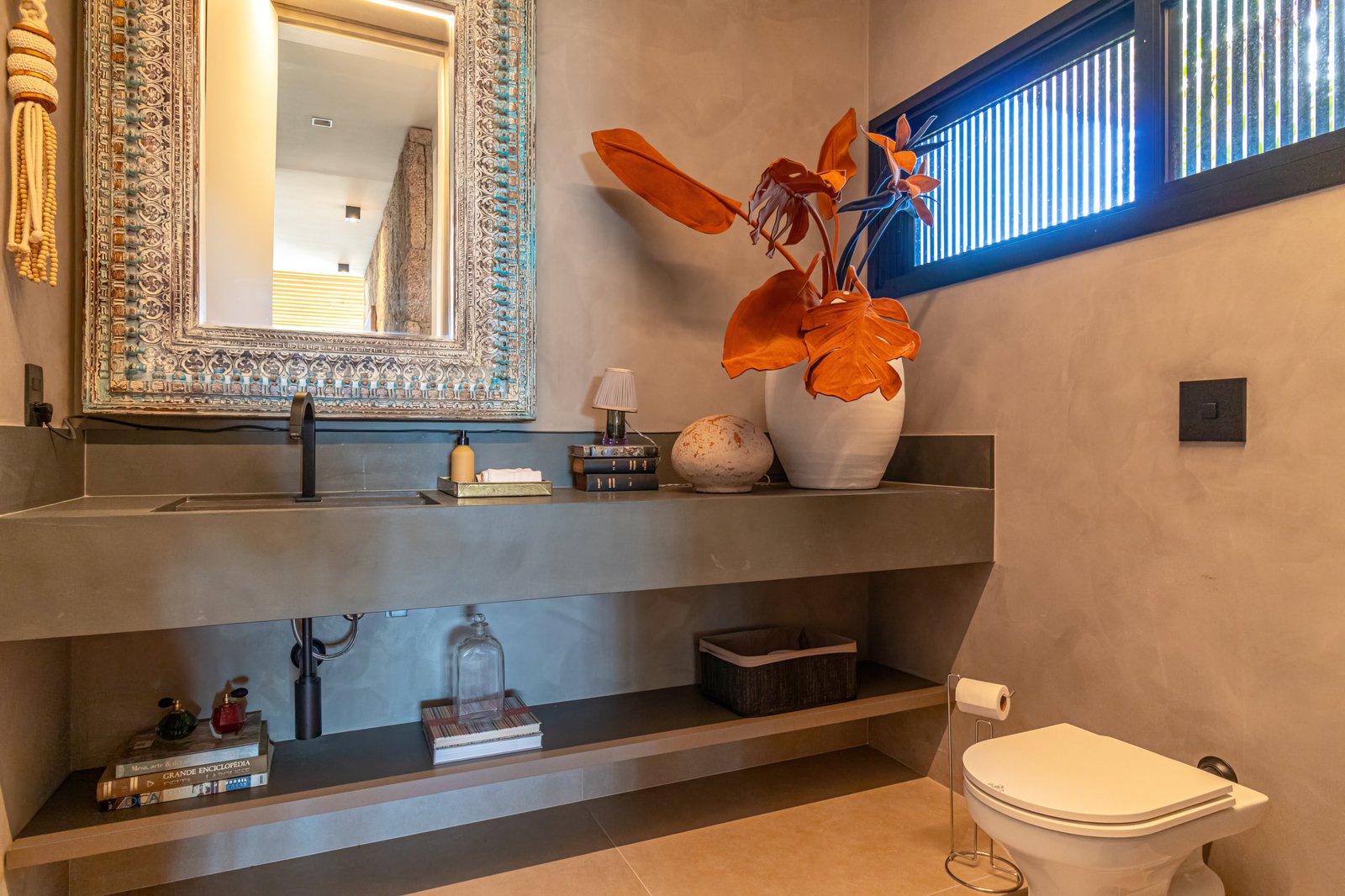 Casa à venda no Condomínio Fazenda da Grama - Itupeva/SP. Residência térrea localizada na parte alta da Fazenda da Grama, em área nobre e silenciosa, fora da rota de aviões e distante dos ruídos do autódromo e de eventos festivos. Com orientação solar norte, o imóvel oferece excelente iluminação natural e conforto térmico ao longo do dia. O projeto arquitetônico é assinado por Lucas Padovani, com interiores desenvolvidos por Paulo Azevedo e paisagismo elaborado por Alexandre Furcolin. A casa conta com cinco suítes, brinquedoteca, quarto de serviço e cozinha equipada com móveis Ornare. Todos os ambientes sociais e o jardim possuem sistema de automação, e a climatização é completa em toda a residência, incluindo uma grelha integrada à sala. A área externa é ampla e contempla um jardim exuberante com pergolado, lareira externa, pomar, horta, campo de futebol e redário. O espaço gourmet é integrado à área social, ideal para receber com conforto e sofisticação. A piscina possui raia, prainha e spa, com aquecimento solar. No rooftop, um generoso deck de madeira oferece vista panorâmica privilegiada. A infraestrutura do imóvel inclui poço artesiano, placas fotovoltaicas, esperas para gerador, tomada para carro elétrico e adega embutida com capacidade para 500 garrafas.